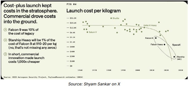 SpaceX changed the game by building reusable rockets that land themselves after launch, ready for the next trip. In 2000, putting a pound of cargo into orbit cost at least $30,000. Today, SpaceX routinely does it for $1,200—cheaper than a new iPhone Pro. That’s a 96% cost reduction!
