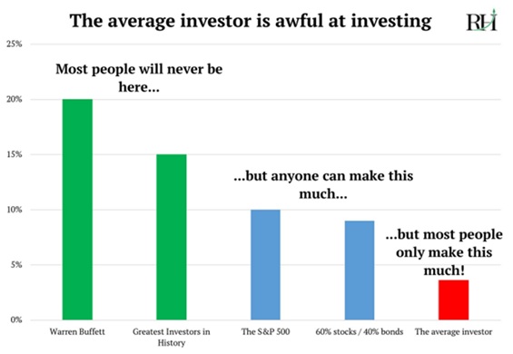 An investor can do literally nothing—just buy the market and hold it forever—and earn 9–10% over the long term. But it’s hard to do literally nothing! People get greedy or scared. They react at the wrong moments.