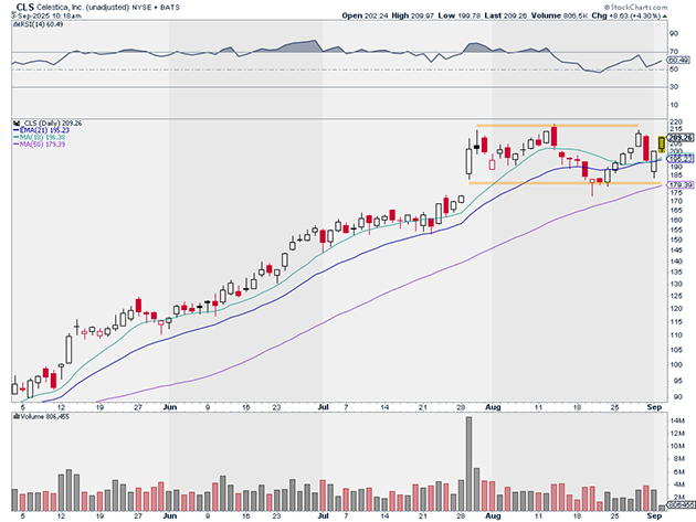On Friday, CLS sold off with its peers. But it never broke support. It’s also rebounded in a big way. It’s easily one of the best-looking AI names following Friday’s scare.