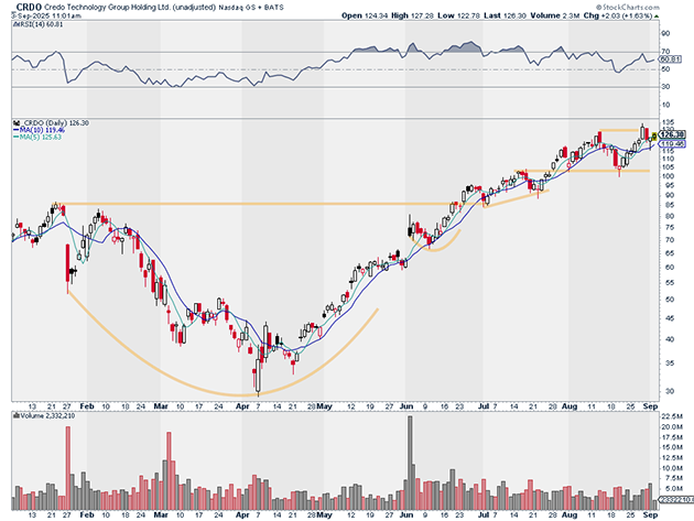 Credo Technology Group Holding Ltd. (CRDO) is another name displaying major relative strength. Like CLS, it sold off on Friday. But there was no follow-through to the downside.