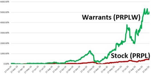 They also require less upfront capital and provide leverage to the underlying stock. Meaning when the stock moves an inch, the warrant can move a mile, as you saw with Purple Innovation.