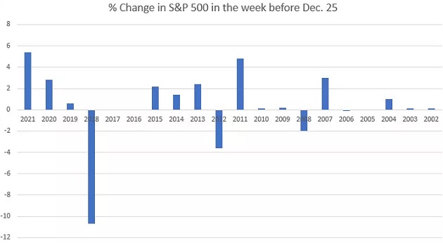 Over the last 20 years, the average return for the S&P 500 in the week leading up to Christmas is only 0.385%. Basically flat.