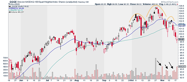 Below, we can see that QQQE is rolling over after putting in a head-and-shoulders pattern. This sort of action often leads to sharp reversals.