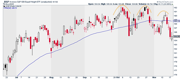RSP is now well below its 50-day moving average, which is starting to roll over: