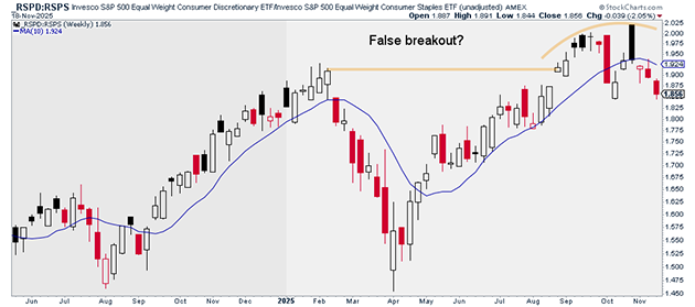 The S&P 500 Equal Weight Consumer Discretionary ETF (RSPD) is also breaking down on a relative basis versus the S&P 500 Equal Weight Consumer Staples ETF (RSPS).