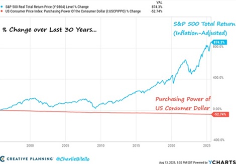 As you can see, the purchasing power of the dollar (orange line) has been more than cut in half over the past 30 years.
