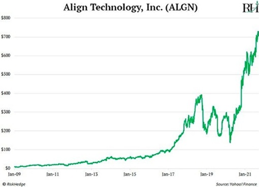 Then, a company called Align Technology (ALGN) created something new. It invented a better way to essentially make braces out of plastic. It’s called Invisalign… and, just like the metal ones, these “braces” straighten your teeth.