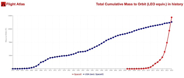 SpaceX = the new NASA. Elon Musk’s rocket scientists have launched more mass into orbit since its first flight in 2006 than the rest of the US combined in its entire history: