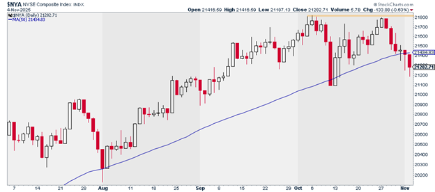 The NYSE Composite Index (NYA) paints a similar picture. It peaked a month ago and is now trading below its 50-day moving average.