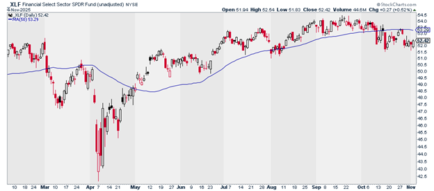 XLF is even weaker than RSP. It’s been trading below its 50-day moving average for the past month or so.
