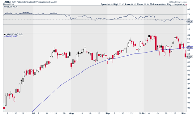 Finally, we have fintech stocks, which are basically the growth stocks of the financial sector. The ARK Fintech Innovation ETF (ARKF) failed to break out last week and now appears to be rolling over.