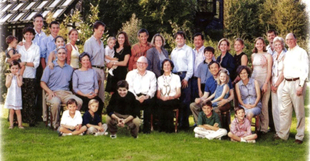 Here he is (center in the white shirt) with his wife Nancy, their nine children, and many grandchildren: