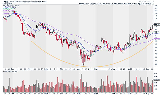 Just look at the SPDR S&P Homebuilders ETF (XHB). It’s up 32% since April and is now breaking out of a multi-month base.