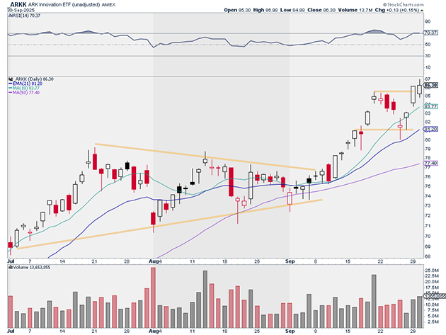 Just look at the recent performance of the ARK Innovation ETF (ARKK). It ripped to new three-year highs yesterday:
