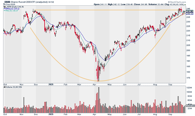 Small caps have been performing well and look to just be warming up. The iShares Russell 2000 ETF (IWM) is climbing out of a base that dates back to late 2024: