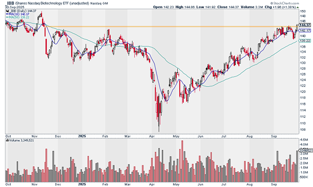 Biotech stocks are also breaking out. Yesterday, the iShares Biotechnology ETF (IBB) hit 10-month highs on big volume: