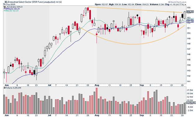 Then there’s industrials. The Industrial Select Sector SPDR Fund (XLI) is on the verge of a big breakout: