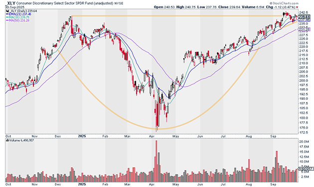 The Consumer Discretionary Select Sector SPDR Fund (XLY) is also setting up for a big move. In fact, it’s on the cusp of breaking out of a base that dates back to late 2025: