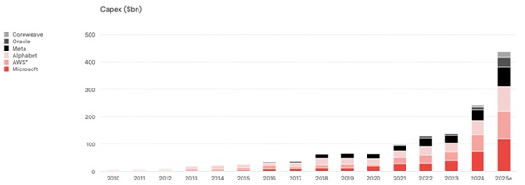 How much big tech companies are spending building AI infrastructure. As you can see, that number keeps going up and to the right: