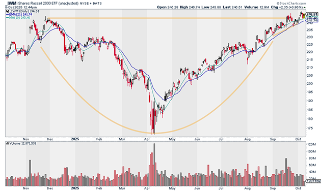 Take a look at the iShares Russell 2000 ETF (IWM) chart below. IWM gained almost 2% last week and is now emerging from a base that dates back to late 2024: