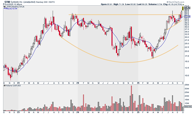 Symbotic (SYM)—one of our robotics plays in RiskHedge Live—has spiked 27% over the past week: