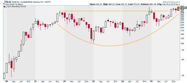 TSLA is arguably the most talked-about stock in the entire market at the moment, and for good reason. It’s just starting to climb out of its four-year base: